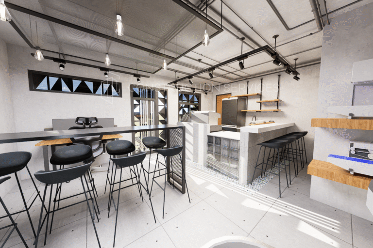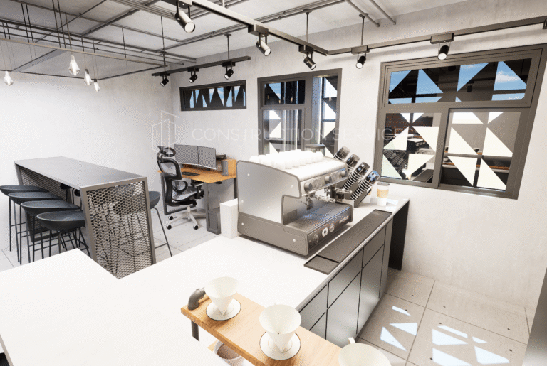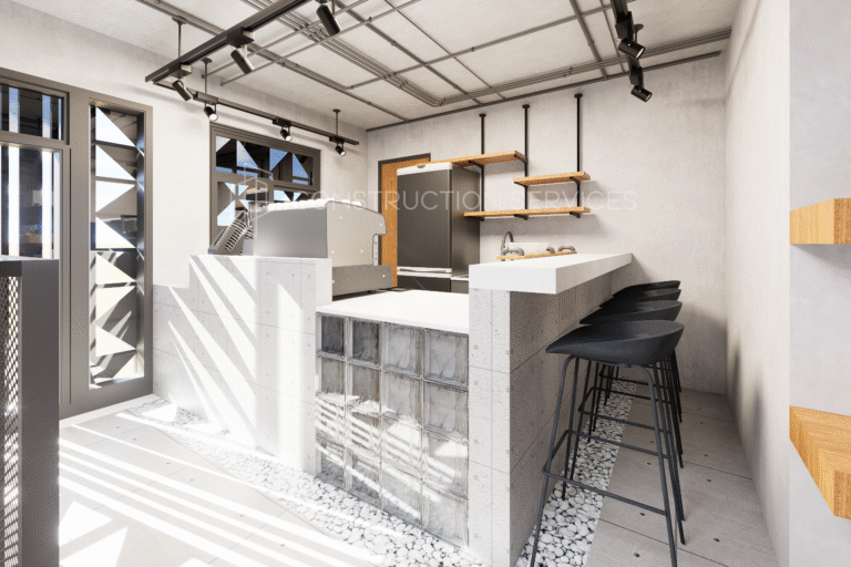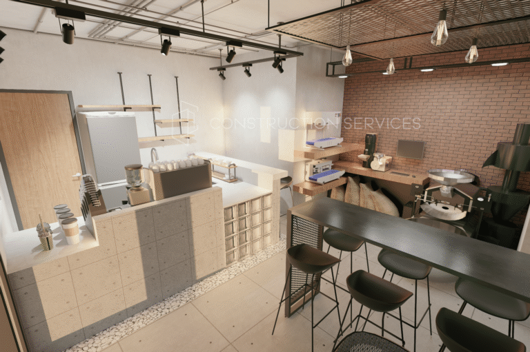 This roastery/cafe interior features a refined concrete finish that captures the essence of modern industrial style. The design blends raw textures with functional elegance from the smooth concrete countertops and tiled surfaces to the exposed ceiling pipes and warm brick accent wall. Sleek black metal fixtures, pendant lights, and minimalist shelving add structure and contrast, while natural elements like light wood and stone details soften the overall look. The open bar area and roasting station are thoughtfully laid out for efficiency and aesthetic balance, creating a space that feels both contemporary and inviting perfect for coffee lovers and creative professionals alike.