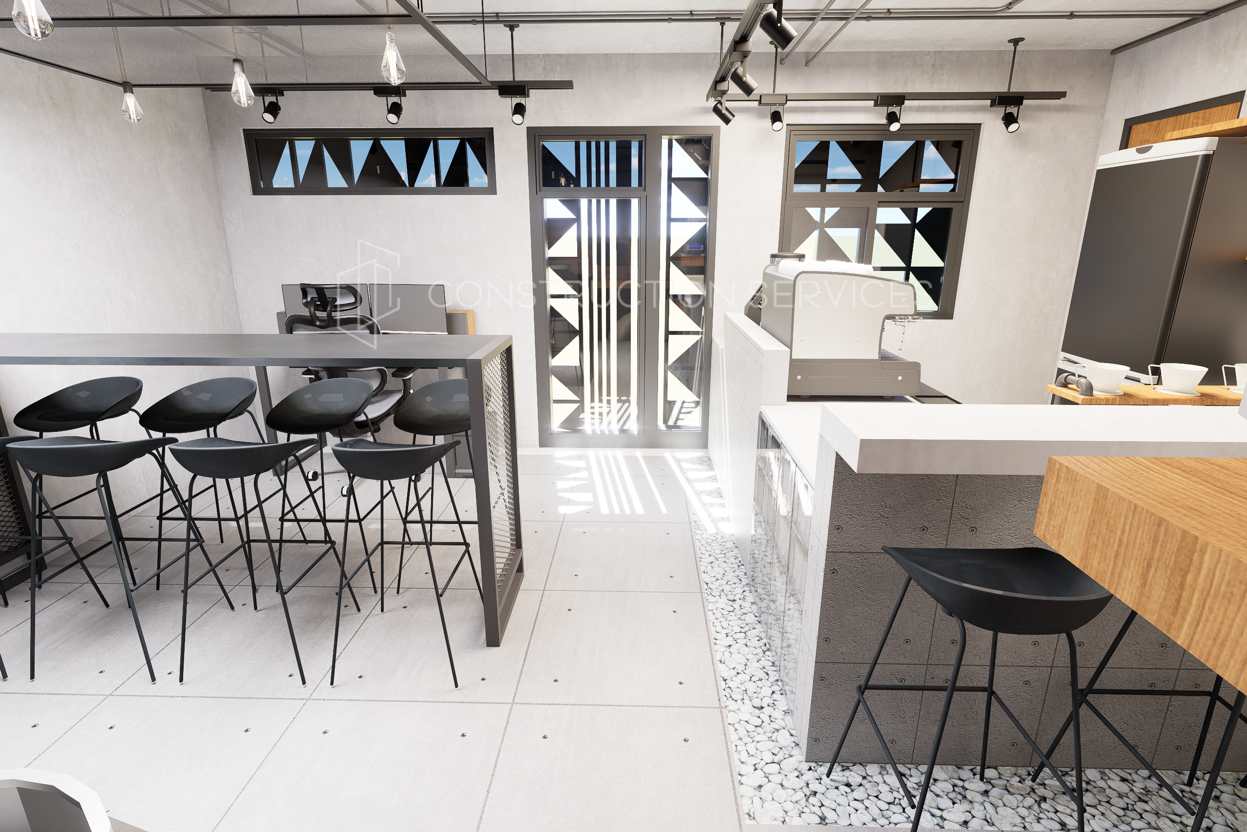 This roastery/cafe interior features a refined concrete finish that captures the essence of modern industrial style. The design blends raw textures with functional elegance from the smooth concrete countertops and tiled surfaces to the exposed ceiling pipes and warm brick accent wall. Sleek black metal fixtures, pendant lights, and minimalist shelving add structure and contrast, while natural elements like light wood and stone details soften the overall look. The open bar area and roasting station are thoughtfully laid out for efficiency and aesthetic balance, creating a space that feels both contemporary and inviting perfect for coffee lovers and creative professionals alike.
